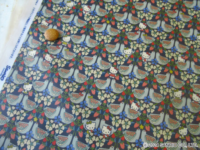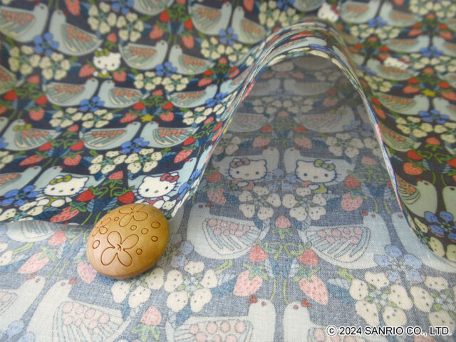 よく見ると、優雅な鳥たちが鏡面レイアウトされた中に、花が咲き誇る枝とジューシーなイチゴに囲まれた可愛いハローキティのキャラクターが隠れています。