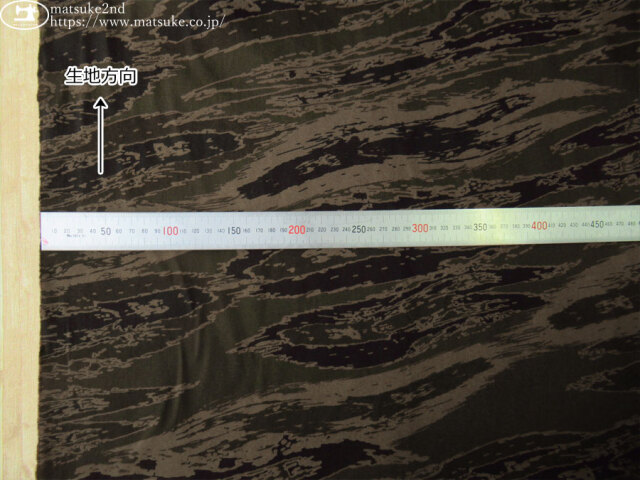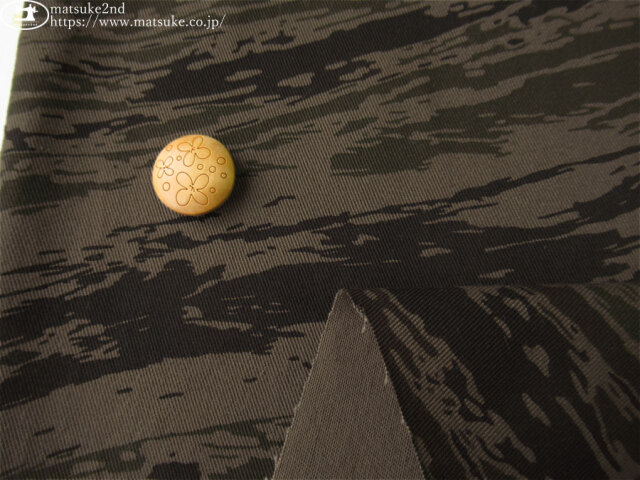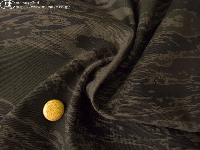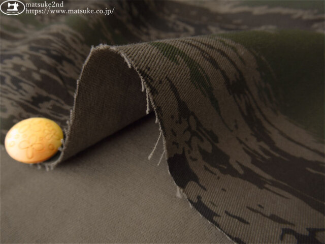 一般的なツイル地程度の中肉生地で、迷彩柄のプリントが施されたカジュアル素材です。