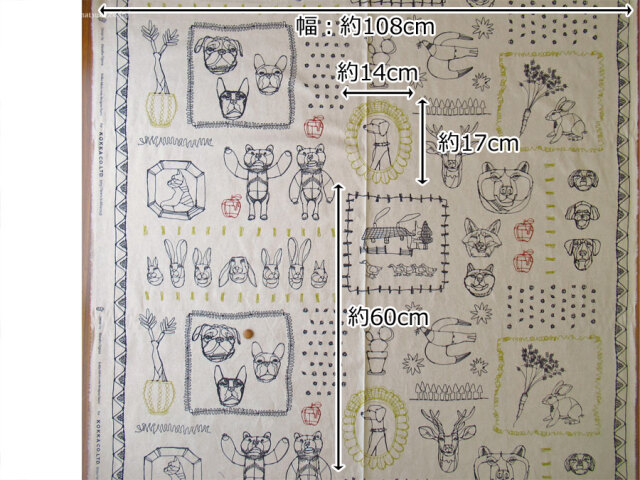 ワイヤーアートでデザインされた愛らしい動物たちがパッチワーク風のプリントがオシャレなファブリックです。