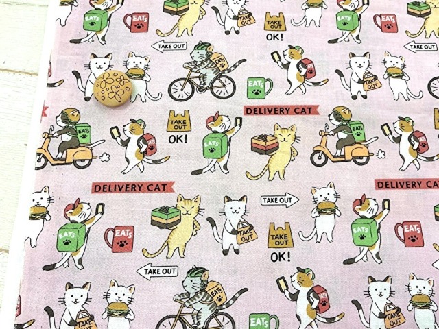 【反売り】コットン スケアプリント 『デリバリーキャット』 ライトピンク系[ 幅108cm×約4.5m ]