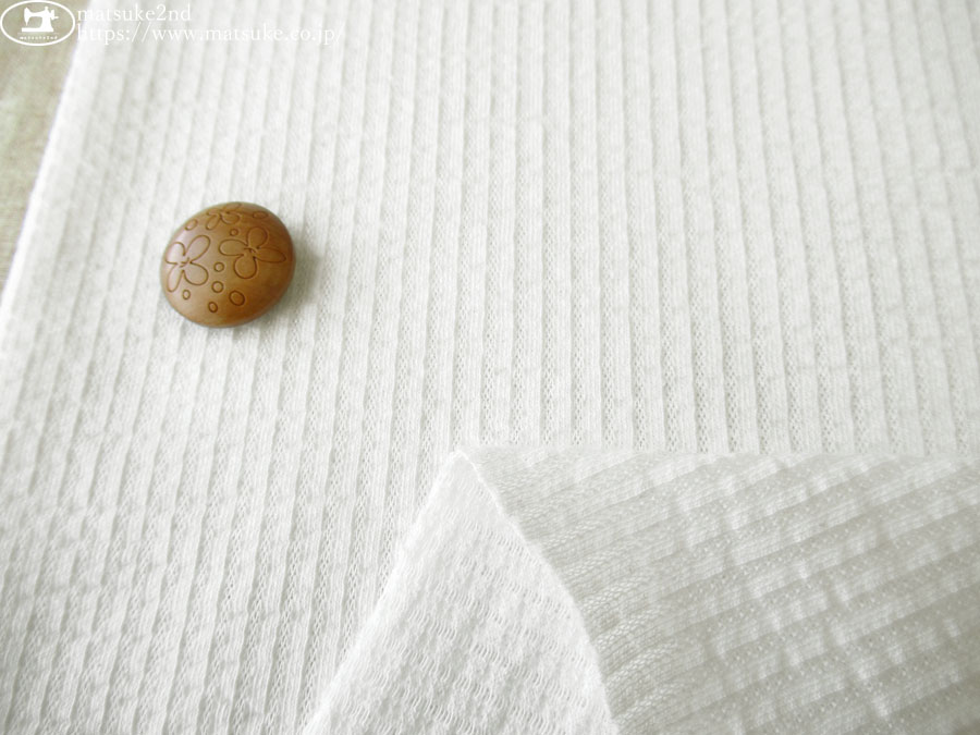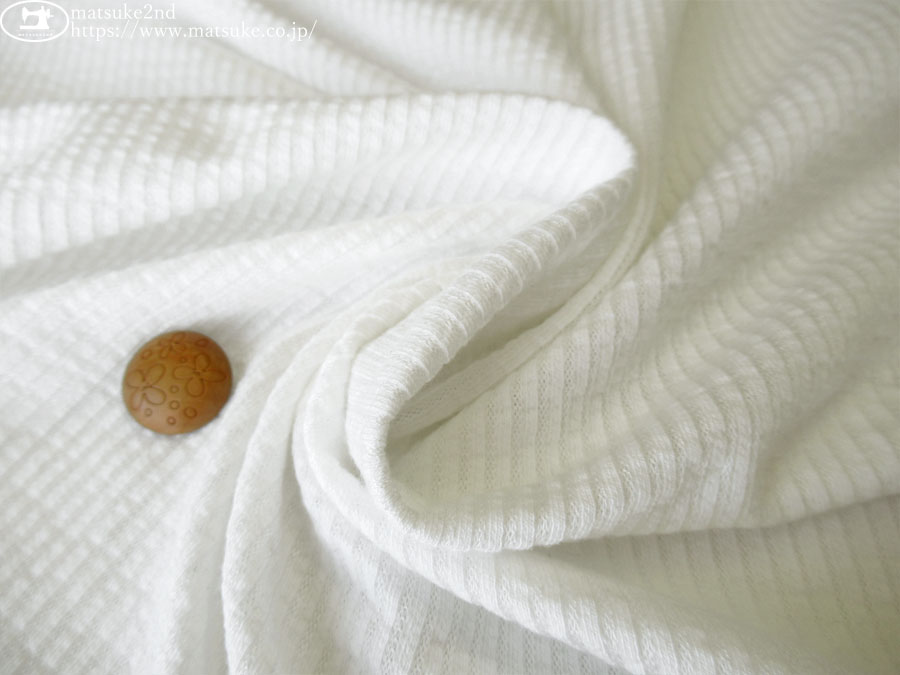 TOP 春夏物生地ニット生地 アウトレット生地ニット地 デッドストック反ニット地 ニット生地柄でさがす無地ホワイト/ナチュラル系 ニット生地柄でさがすストライプ柄 ニット生地種類でさがすその他 ニット生地素材でさがすコットンコットン混紡 ニット生地素材でさがす合繊ポリエステルポリエステル混紡 新着商品[2026/4/28] 【デッドストック反】 T/Cヒッコリーストライプニット オフホワイト 165cm幅 コットン、ポリエステル(混紡率不明) テンション中 ぽこぽことした凹凸感と自然な立体感のあるストライプ柄が魅力のがヒッコリーニット生地です。 一般的なTシャツ地程度のほどよい厚みで、柔らかくさらっとした肌触りです。 オフホワイトカラーなので、肌の色がほんのり透けます。 横方向に伸縮性があります。 プルオーバータイプのトップスやチュニックなどのお洋服にいかがでしょうか。 ※ボタンの大きさ2cm 【デッドストック反】 T/Cヒッコリーストライプニット オフホワイト 価格: ¥240 (税込 ¥264) [ポイント還元 2ポイント~] 販売期間: 数量: ×50cm 品番/カラー在庫購入np-9500 オフホワイト○ 品番/カラー在庫購入np-9500 オフホワイト○ 返品についての詳細はこちら
