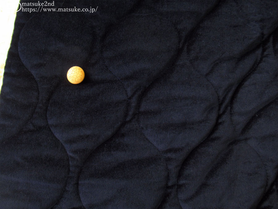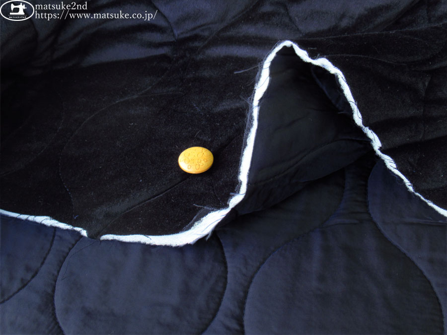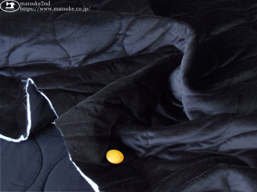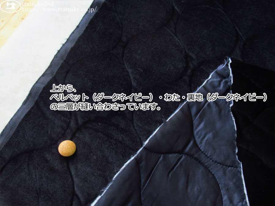 上から、ベルベット(ダークネイビー)・わた・キュプラ裏地(ダークネイビー)の三層が縫い合わさっています。