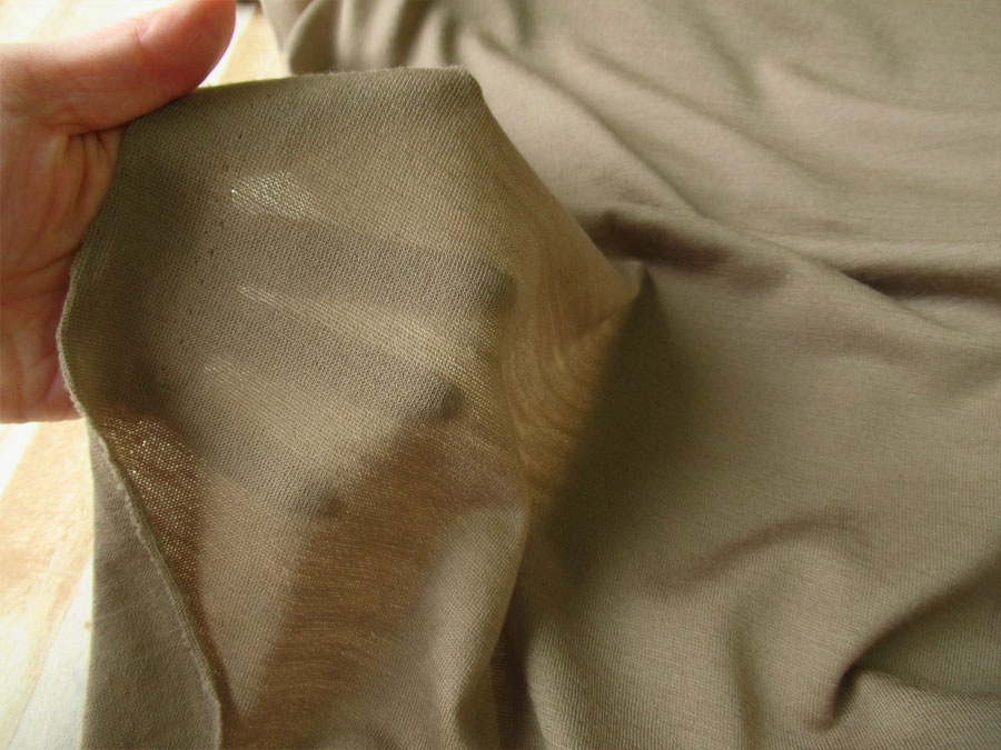 一般的なTシャツ地くらいの厚みで、ゆるく編み上げたソストでくったりとした天竺素材です。