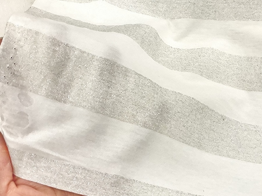 【反売り】 やや薄手 ラメ太ボーダー天竺ニット オフ×シルバー系[ 幅150cm×約8m ]