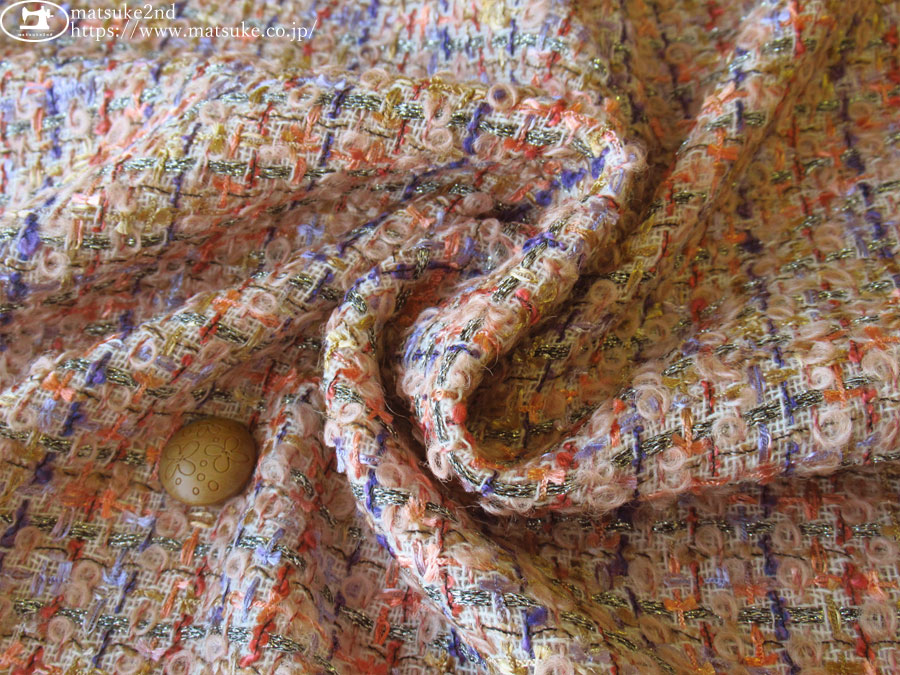 カラフルな糸とシルバーのラメ糸を織り交ぜた、華やかなチェック柄のツイード生地です。